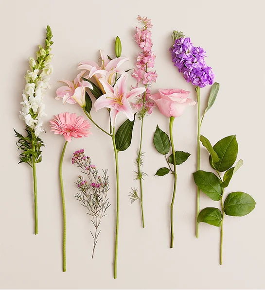 - All-around arrangement with pink roses, Oriental lilies, Gerbera daisies and larkspur; white snapdragons, lavender stock and purple waxflower; accented with assorted greenery